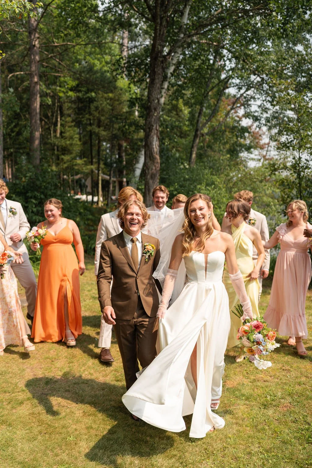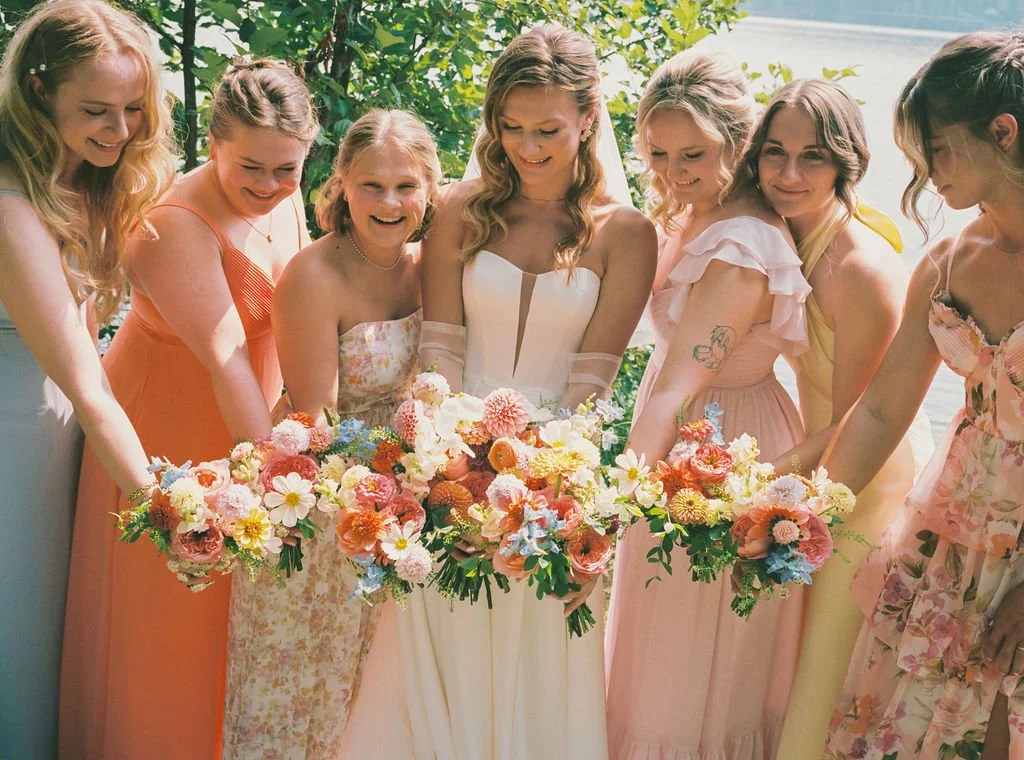 The colors of the day mirrored that vibrancy. The bridesmaids wore bright, joyful dresses, hues that felt alive against the greens and blues of August. Each color distinct, yet harmonious. The groomsmen stood beside Chris in light linen suits, effortlessly relaxed and perfectly suited for the warmth and the setting. Nothing felt stiff. Nothing overly curated. It was elegant, but breathable. Refined, yet full of personality.
